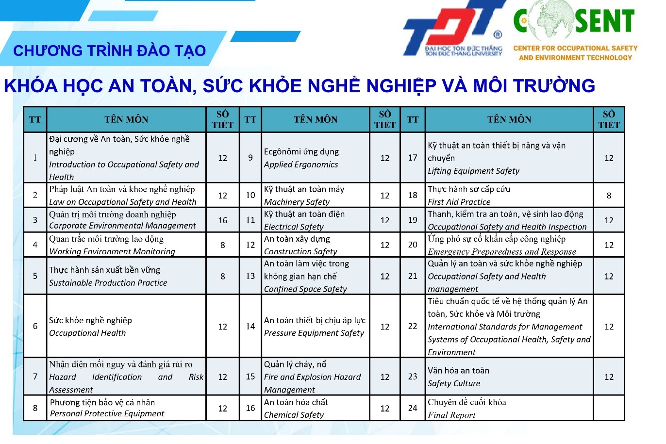 6. CHỨNG NHẬN: Học viên hoàn thành tất cả các môn học trong chương trình đào tạo có điểm trung bình toàn khóa học lớn hơn 5.0 sẽ được cấp chứng nhận khóa học bởi Trường Đại học Tôn Đức Thắng và bảng điểm bởi Trung tâm An toàn lao động và công nghệ môi trường.